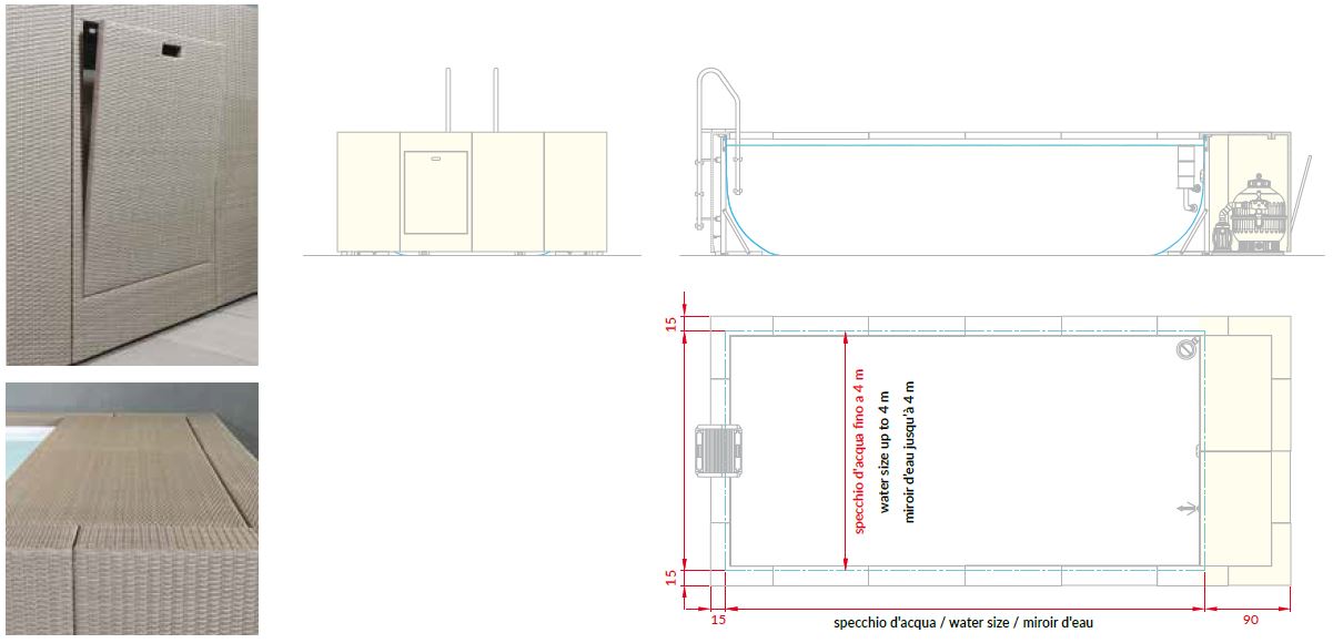 Nella versione Dolcevita DIVA LTI il vano tecnico viene alloggiato in uno dei lati del bordo vasca appositamente ampliato di 90 cm. Accessibile da un pratico sportello per la manutenzione. Questa variante è disponibile solo per le larghezze 3 e 4 mt e le lunghezze fino a 9 mt.