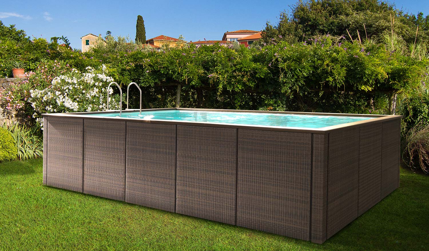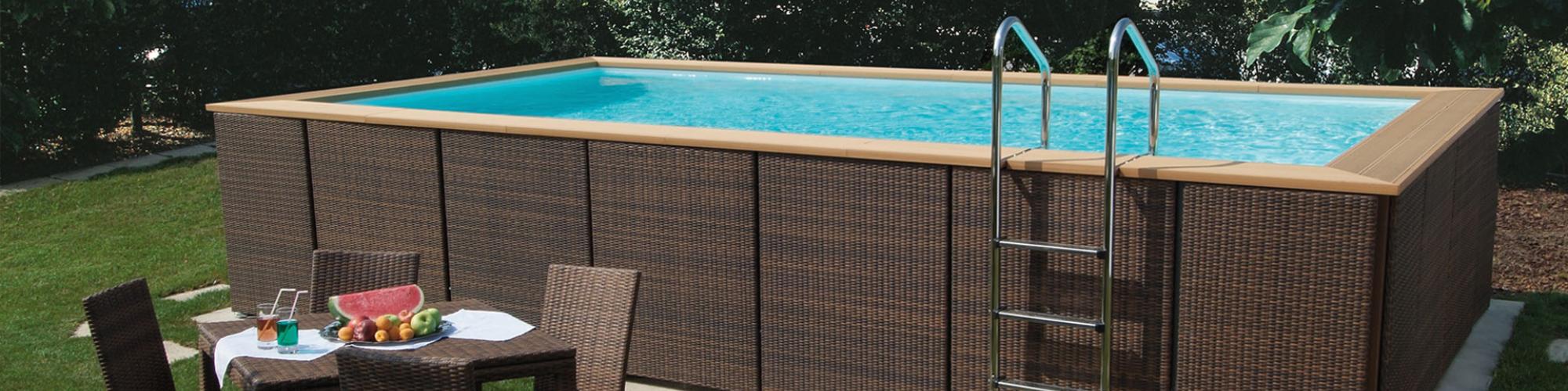 E’ possibile contornare la piscina Dolcevita con un bordo in legno composito Plastic Wood, utilizzato nella finitura Rattan, o con l’esclusiva combinazione di pannello e bordo in fibra sintetica intrecciata, disponibile in vari colori.