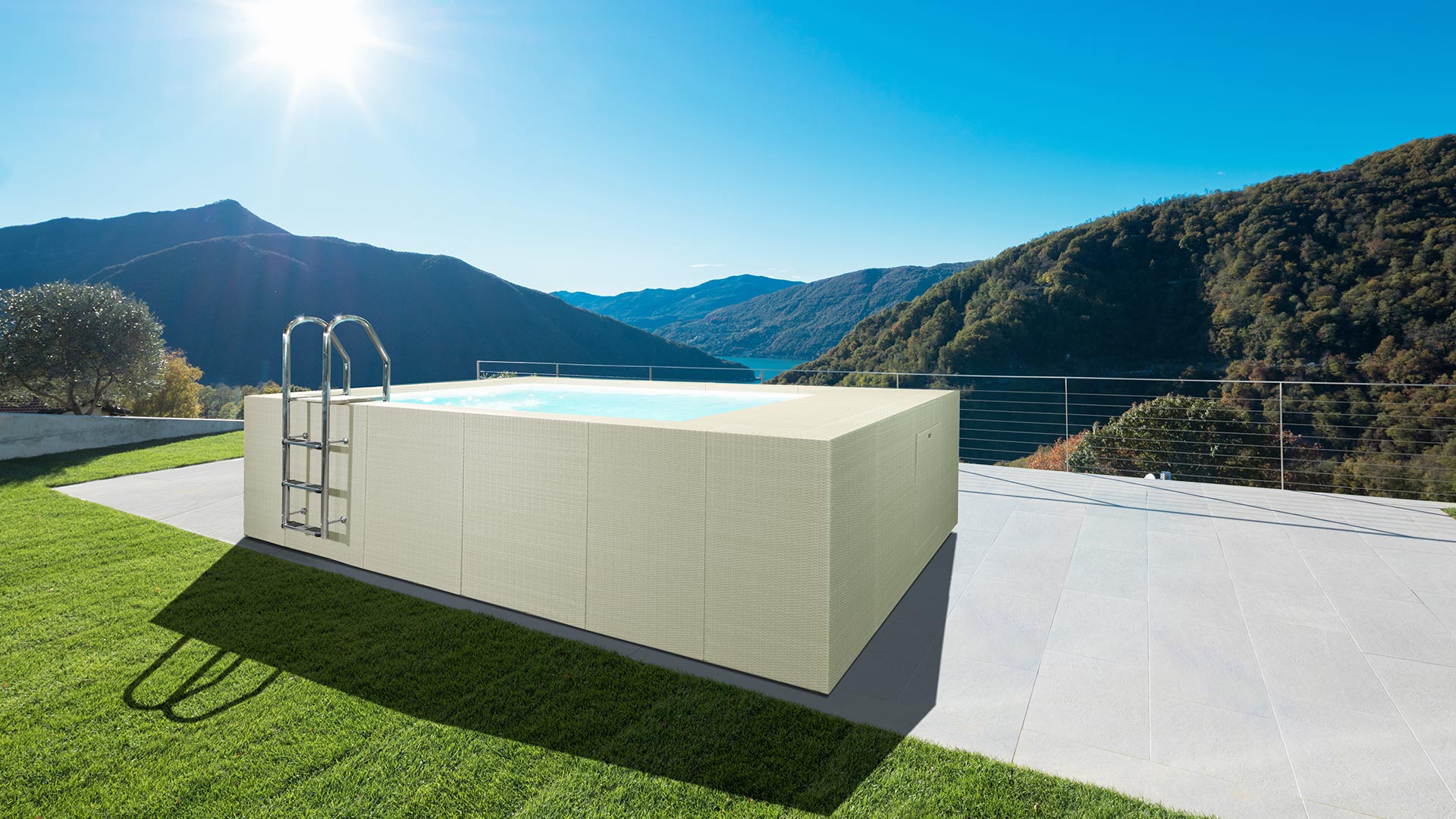 Dolcevita DIVA è caratterizzata dal rivestimento di finitura esterna che continua fino al bordo vasca, conferendo alla piscina un design molto moderno ed elegante. Anche in questo caso i pannelli sono in fibra sintetica, disponibili nei colori bianco e grigio.