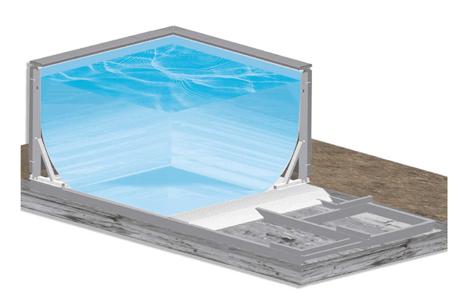 La struttura di Dolcevita è realizzata in Acciaio Magnelis con copertura epossidica (tecnologia ZMSV-TEC). Il piede del traliccio e tutta la bulloneria sono in acciaio inox. La piscina è montata su basamento in CA oppure sullo speciale basamento in acciaio.